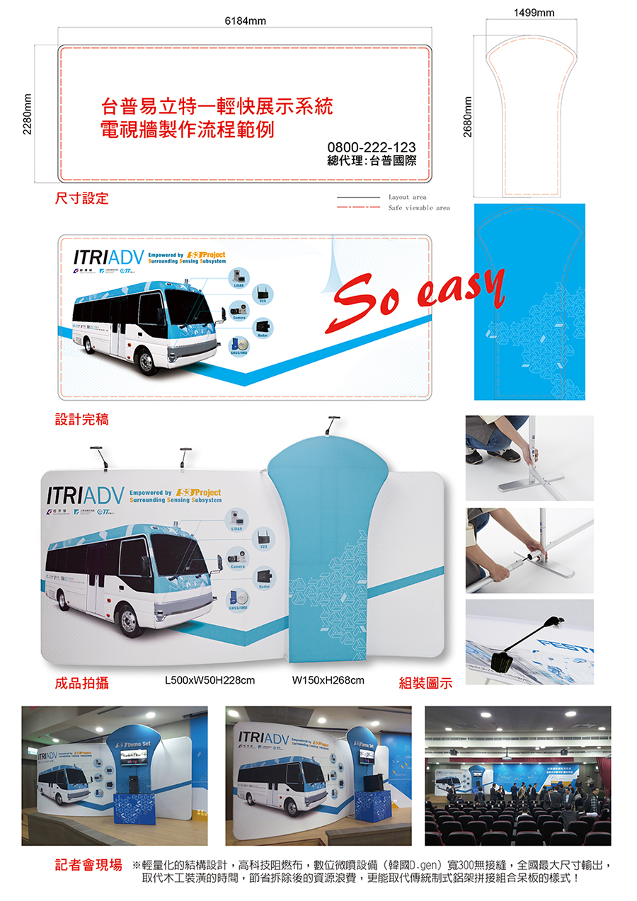 輕量且完全客製化的結構設計,高科技阻燃布,數位微噴設備(韓國D.gen)寬300公分無接縫,全國最大輸出尺寸,重複使用能取代木工裝潢的時間,節省拆除後的資源浪費,更能取代傳統制式鋁架拼接組合呆板的樣式!