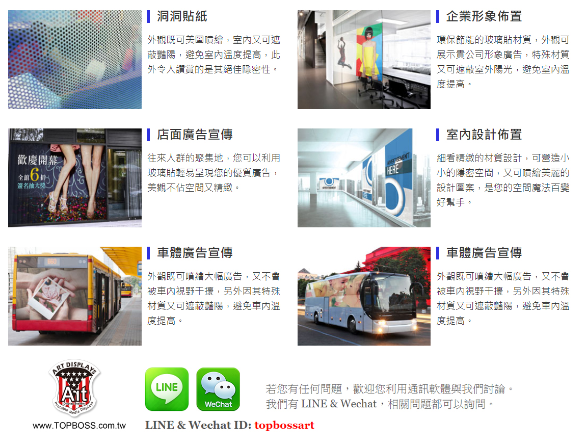 適用於會議室、貴賓室、參訪間的空間玻璃佈置。其原理與隔熱紙相同,材質具有遮陽效果及隱密性。正面噴繪圖案後就看不到後面景物,背面則無圖案,可於背面空間看穿外景,較常使用於室內外玻璃佈置。可依場地需求尺寸做設計,營造現場氣氛。健豪提供各種相關材質給客戶選擇製作,我們的印件品質、交件速度位居全台之冠!