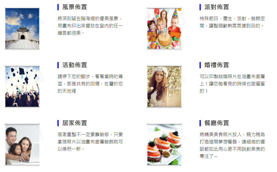 適用於空間規劃佈置、牆面懸掛展示、送禮紀念,與一般遮光布相比具有防水、遮陽等優點,更能有效防止紫外線。健豪的製作品質極為優良,且截稿時間為全台最晚,交件速度位居全台之冠,我們提供線上編輯器服務與全台最多樣的版型,讓不會設計軟體也能製作出精美的專屬窗簾,快將家裡窗簾變成您的畫布吧!