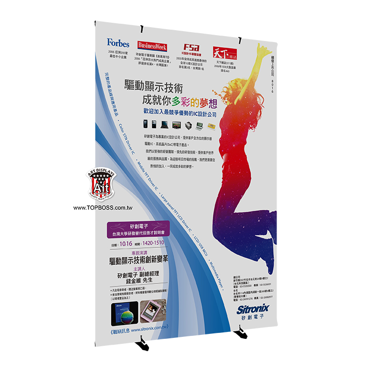 產品特性: 您可能從沒有想過,促銷展示活動能如此簡單,只要60秒時間,二個步驟,圖像立即展示,且為系統性展示架,因應不同場地畫面只須添購配件即可改變,簡單簡潔又大方,有助於提昇企業優質形象。