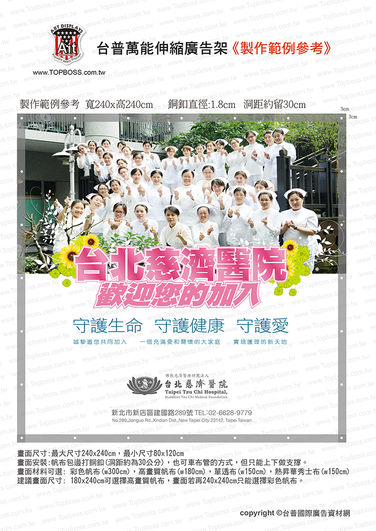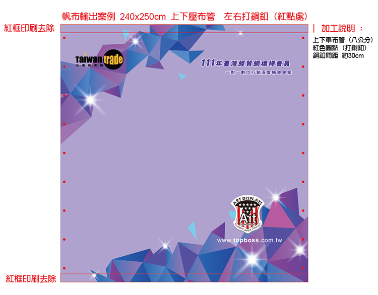 畫面安裝: 可在四邊打銅釦(洞距30公分),也可車布管的方式,但只能上下做支撐。(請參考捷安特圖示部分)