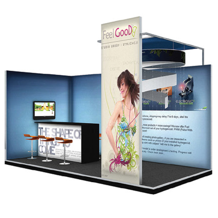 但是在展位的正面和背面可能會使用剛性面板。這個 Magic-window系統將定制模組化解決方案發展成一個可提供高達 30'x30“展位系統。Magic-window 解決方案非常適合國際大型展會,特殊活動裝飾和銷售點展示。