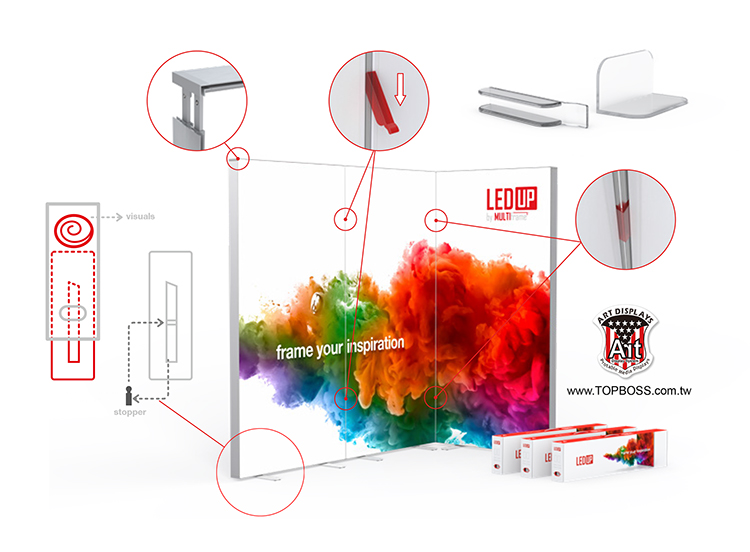通過使用創新,獨特且無需工具的互鎖系統,可在幾秒鐘內完成框架的設置。將零件從箱子中取出,無需工具即可將其滑動到一起。連接畫面面板組裝完成。另外您可以使用直的 (平面連接) 或 90°轉角的 (連接器) 將燈箱強組合起來以創造無盡的LED燈箱展示牆。