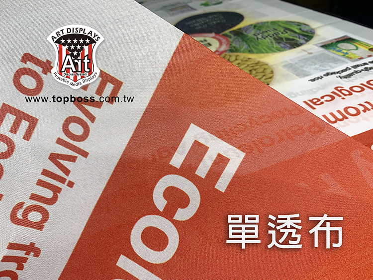 產品特性:輪出後只呈現單面圖文效果,適用展覽佈置,店面橫式、直式全彩布條,搭配各式掛軸或配合旗竿、旗座配件、或後加工。