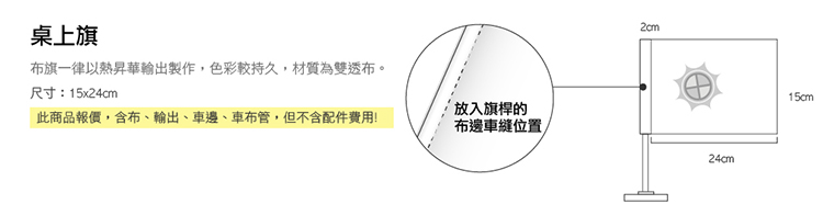 產品特性:雙透布桌上旗,適合放置於辦公桌、接待處、迎賓處、等地方,搭配桌上型底座。營造氣氛的好幫手 適用於企業、聚會、活動擺飾、婚禮裝飾、行銷活動、選舉造勢...等各種空間的展示佈置,在百貨公司、商家、公司等節慶活動時,更是櫃檯、桌台上最簡易的宣傳廣告,幫您把活動佈置的最便宜又有趣,有效提升廣告宣傳效果!