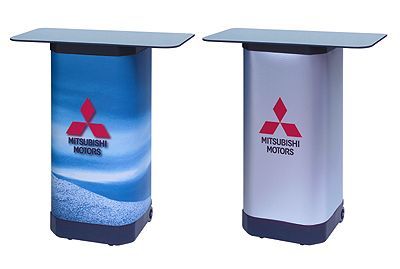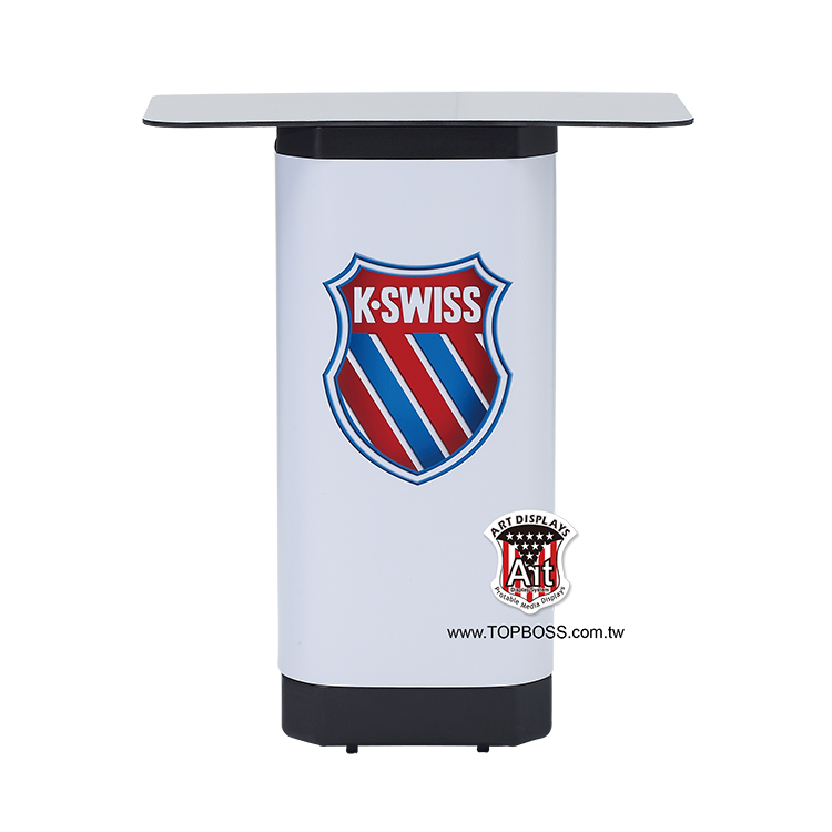產品特性︰利用一個帶輪多功能航空拉桿包,加上膠板加工而成簡易形櫃台,桌板收起時可置入拉桿包,節省攜帶之空間,畫面可用輸出方式或卡點西得加工。