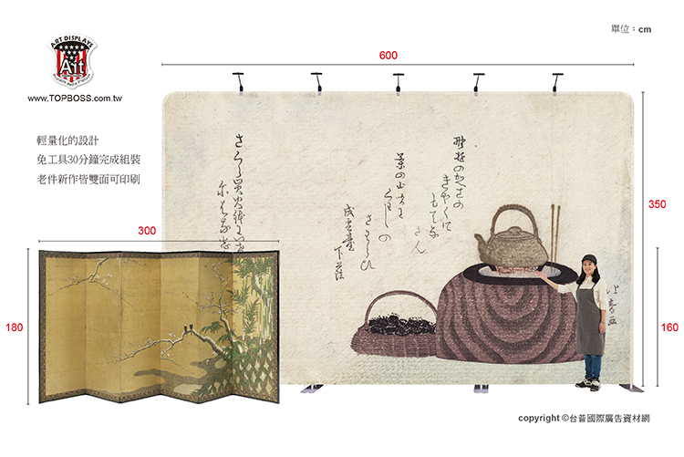 輕量且完全客製化的結構設計,高科技阻燃布,數位微噴設備(韓國D.gen)寬300公分無接縫,全國最大輸出尺寸,重複使用能取代木工裝潢的時間,節省拆除後的資源浪費,更能取代傳統制式鋁架拼接組合呆板的樣式!