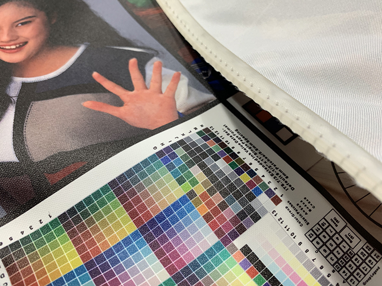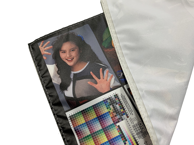 防水無紡布:材質相對柔軟,表面光滑。硬度相比較於UV軟膜會高一點,但防水無紡布,透光性能優秀。此外,防水無紡布背面比正面的布料紋理深一些。布料的纖維很細,在2.8倍的放大鏡頭下可以看見布面的排列依舊很緊密。