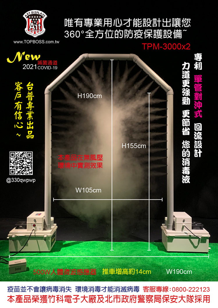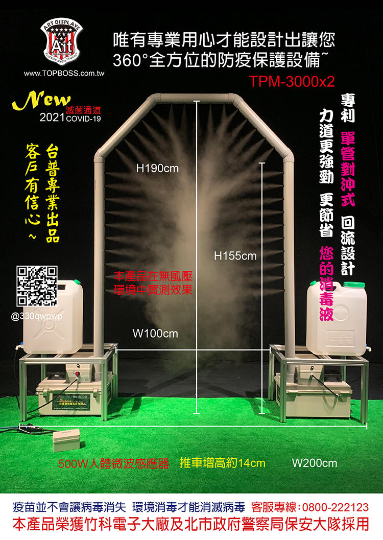 超音波造霧系統,是利用每分鐘一百七十萬次的震盪頻率,將水分子霧化產生水霧及大量的負離子,而製造出來的水霧,藉由風的帶動飄出機器外,搭配"組合型人群防疫滅菌通道"讓大量的水霧集中在空間內,能有效消滅空氣中的病毒。