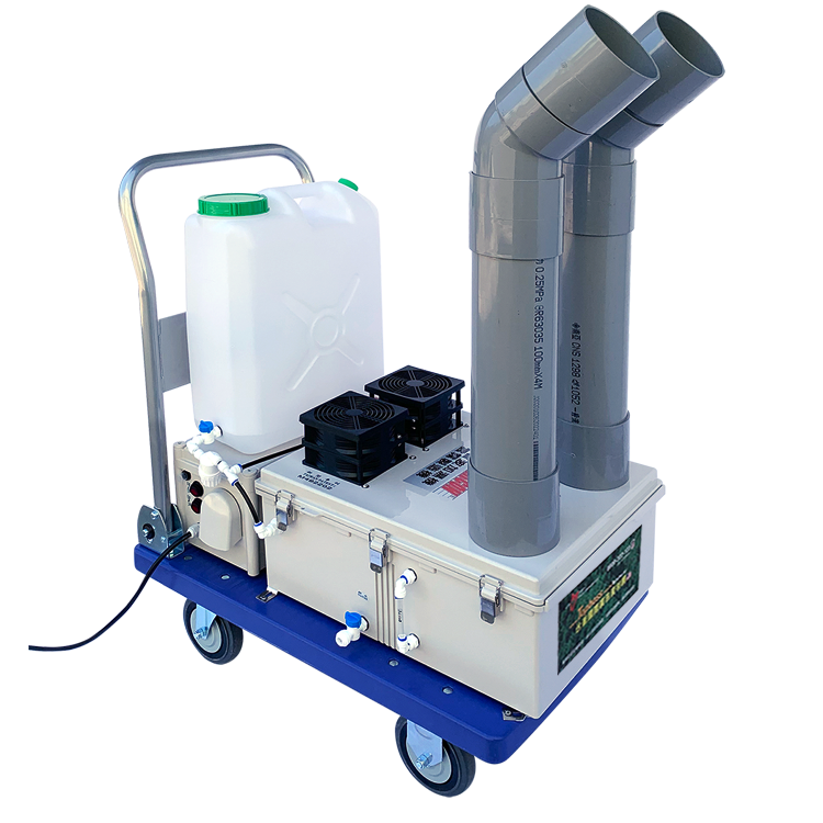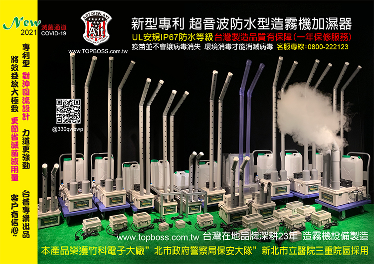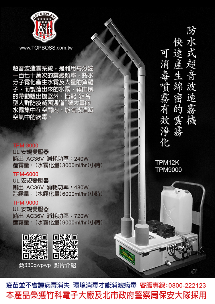 超音波造霧系統,是利用每分鐘一百七十萬次的震盪頻率,將水分子霧化產生水霧及大量的負離子,而製造出來的水霧,藉由風的帶動飄出機器外,搭配"組合型人群防疫滅菌通道"讓大量的水霧集中在空間內,能有效消滅空氣中的病毒。超音波造霧系統能將消毒液霧化成1-10微米的消毒顆粒,快速地附著於人體 或物體表面,從而消滅病毒,可有效預防新型冠狀病毒的傳染~