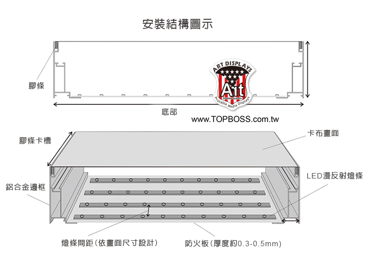 台普國際廣告資材網,在卡布燈箱產品結構上設計可攜帶組合,並且可以散件運輸長度尺寸控制在150cm,也可以到現場成品安裝,8至12cm卡布燈箱為常用規格。卡布燈箱畫面的安裝方法是,畫面四邊縫膠條,將縫完膠條的畫面卡進卡布型材的卡槽裡,這也是卡布燈箱名稱的由來~
