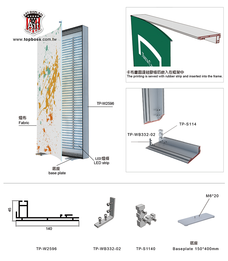 台普國際廣告資材網,在卡布燈箱產品結構上設計可攜帶組合,並且可以散件運輸長度尺寸控制在150cm,也可以到現場成品安裝,8至12cm卡布燈箱為常用規格。卡布燈箱畫面的安裝方法是,畫面四邊縫膠條,將縫完膠條的畫面卡進卡布型材的卡槽裡,這也是卡布燈箱名稱的由來~