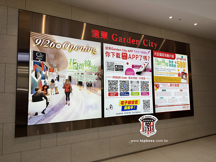 當卡布燈箱的常規尺寸不能滿足廣告畫面尺寸較大的要求時,可以將多塊卡布燈箱拼接為一體展現。卡布燈箱的廣告畫面色彩光澤勻稱、賦有立體感,同時具有較強的防曬防水性,採用LED漫反射捲簾式燈條做為卡布燈箱光源,光源亮度勻稱無陰影,色彩鮮艷飽和度高,畫面展示效果逼真。目前我司可大幅印製3米寬及5米寬無接縫的材質,在器材上也設計了組合式的框架結構,在物流運輸上方便許多,減少早期燈箱需要專車運送的問題,但是組裝上難免有些要技巧性及安全性的問題,建議還是需要專業人士現場組裝。