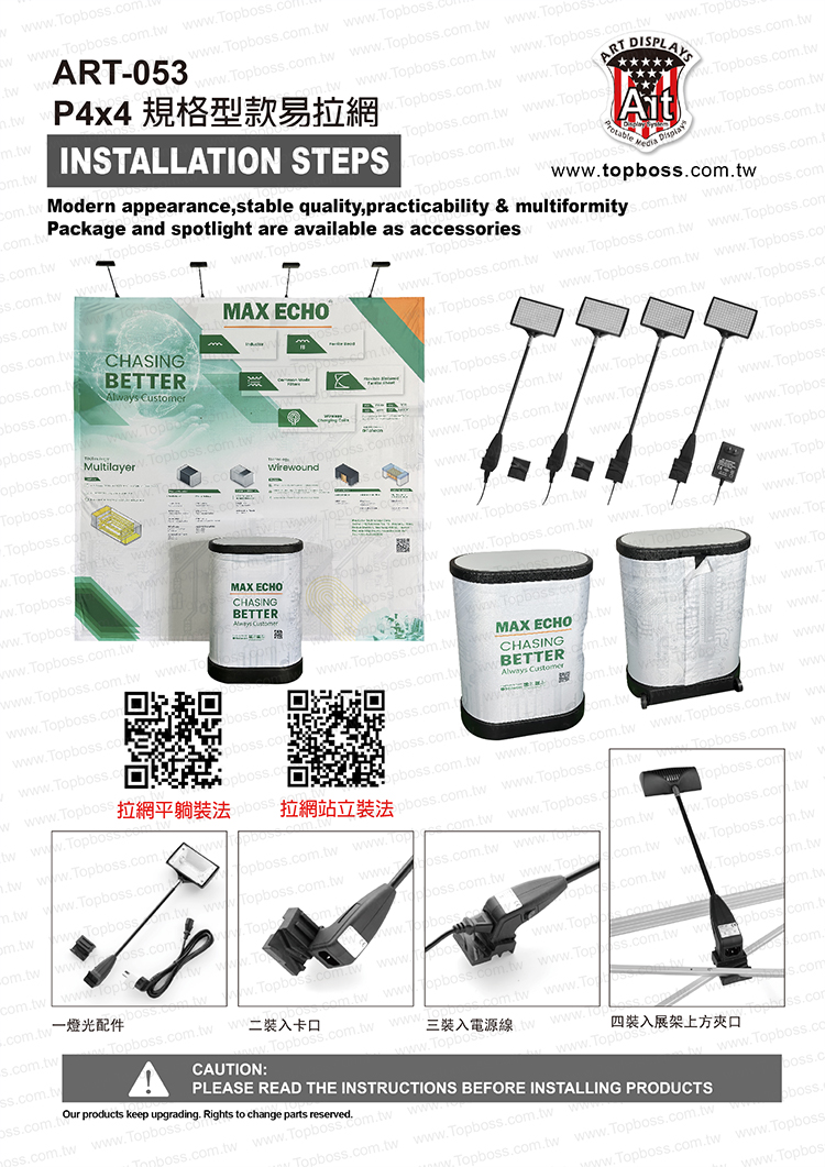 產品特性: 2023年最Hot的展示器材.操作簡單使用方便.重量最輕一體成型.畫面可更換.只要一分鐘.效果立即呈現.適用展覽會場.展覽廣告.巡迴展示.商業促銷.