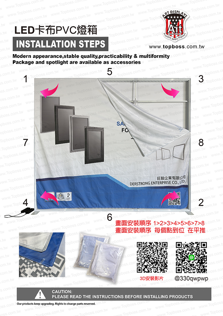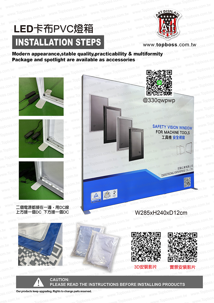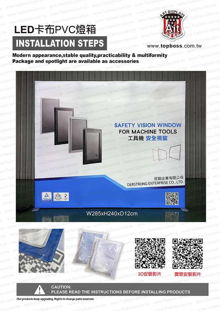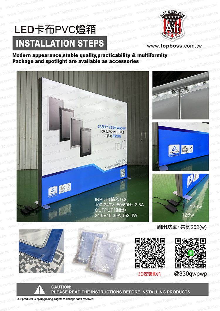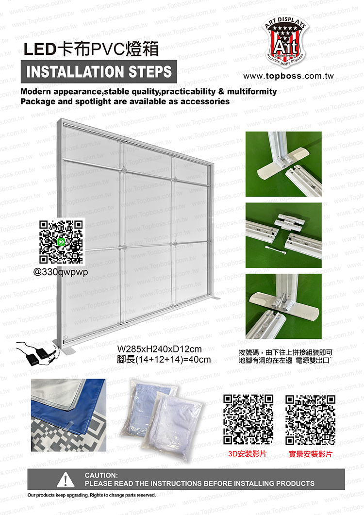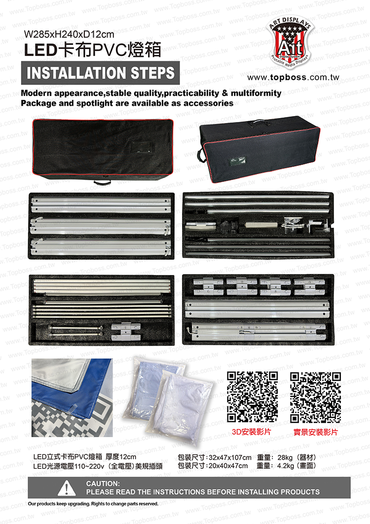 產品設計為携帶組合式燈箱,收納運送尺寸符合一般轎車即可運送,前置畫面為背打光無接縫阻燃燈布,後置為黑白遮光布易於攜帶,畫面摺疊展開後平整無摺痕,LED打光後讓您的廣告畫面光彩奪目~