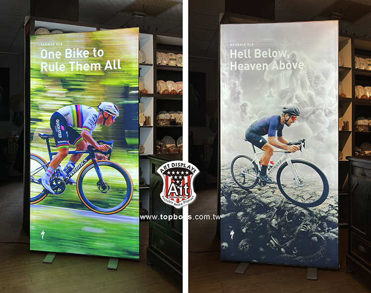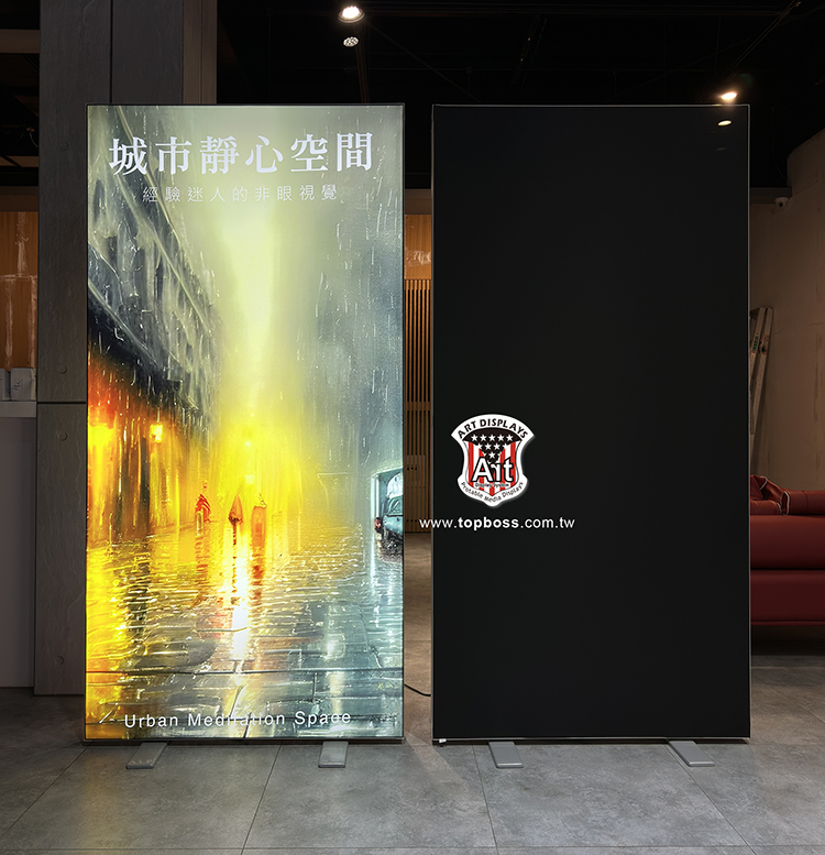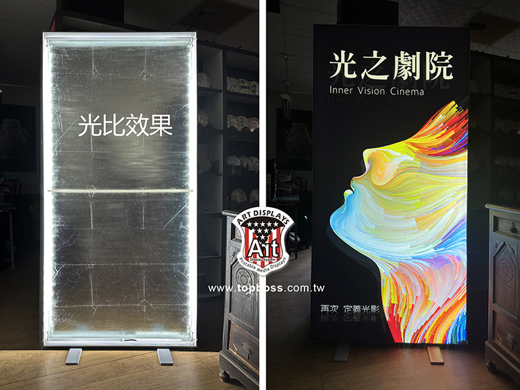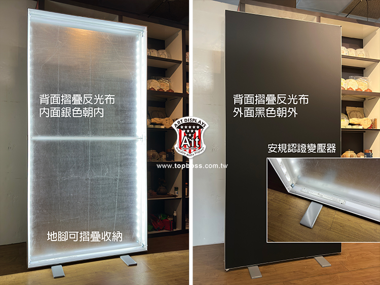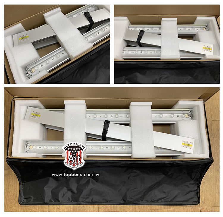 ※ 產品設計為携帶組合式燈箱,收納運送尺寸長度為140cm,鋁材重量約為22kg,一般轎車即可運送,前置畫面為背打光無接縫阻燃燈布,後置為黑白遮光布易於攜帶,畫面摺疊展開後平整無摺痕,LED打光後讓您的廣告畫面光彩奪目~