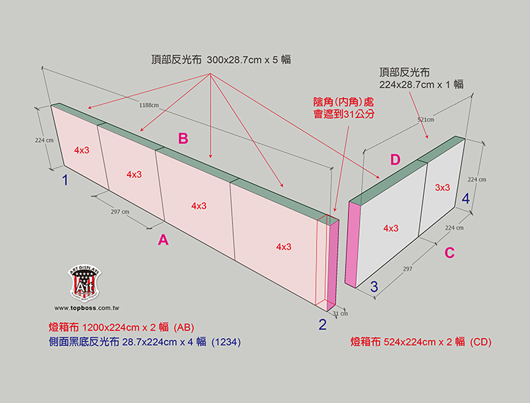 可選擇有: (一) 內打燈(LED燈箱) (二) 外打燈 頂燈方式