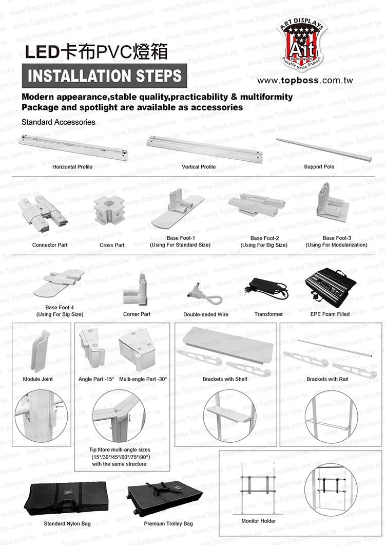 產品設計為携帶組合式燈箱,收納運送尺寸符合一般轎車即可運送,前置畫面為背打光無接縫阻燃燈布,後置為黑白遮光布易於攜帶,畫面摺疊展開後平整無摺痕,LED打光後讓您的廣告畫面光彩奪目~