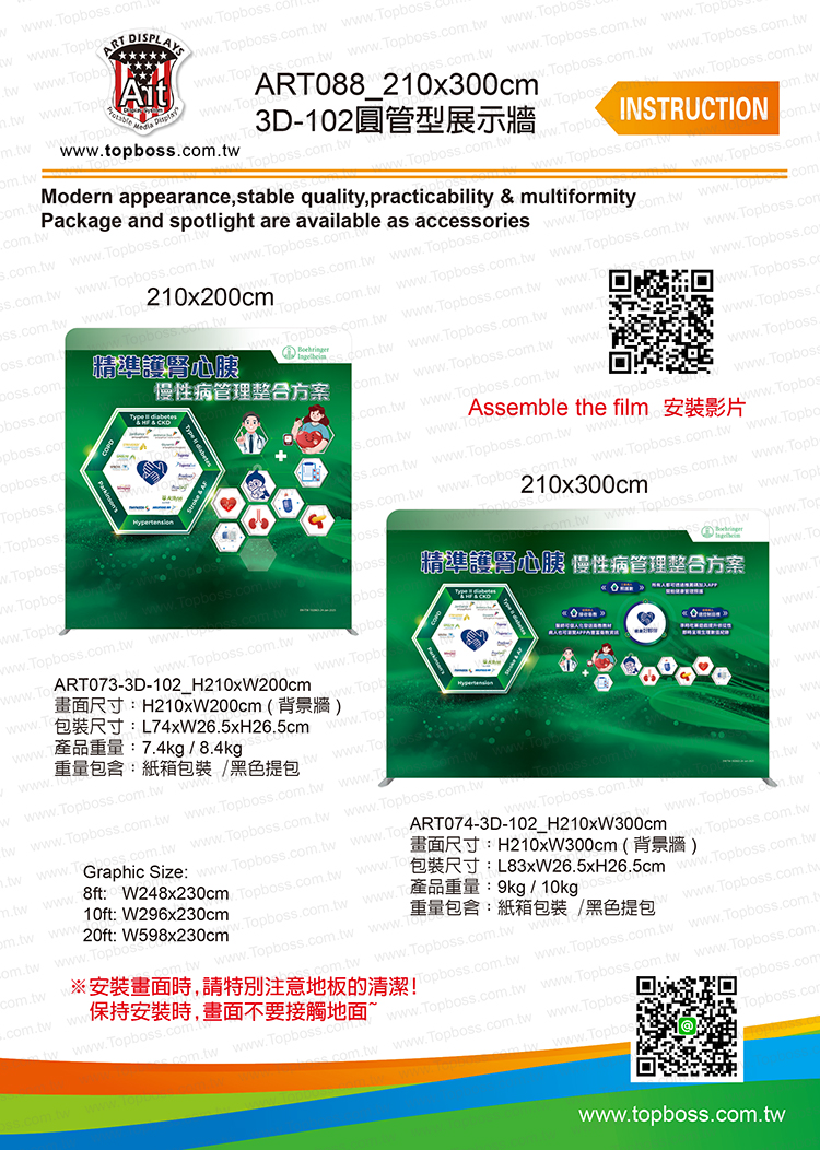 兩個人30分鐘即可輕鬆搭建完成,取代木工耗時搭建及呆版傳統的制式攤位,取代帆布搭起後的縐褶與反光效果,非常適展覽會場、記者會背景牆、大型活動背景牆、任何室內活動場地背景、百貨商場和飯店廣告牆、品牌行銷、產品廣告..........等,無加工時最寬320cm無接縫,長度可達1200cm (12米)以上。