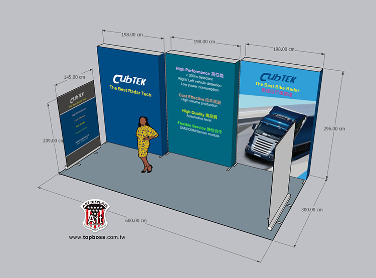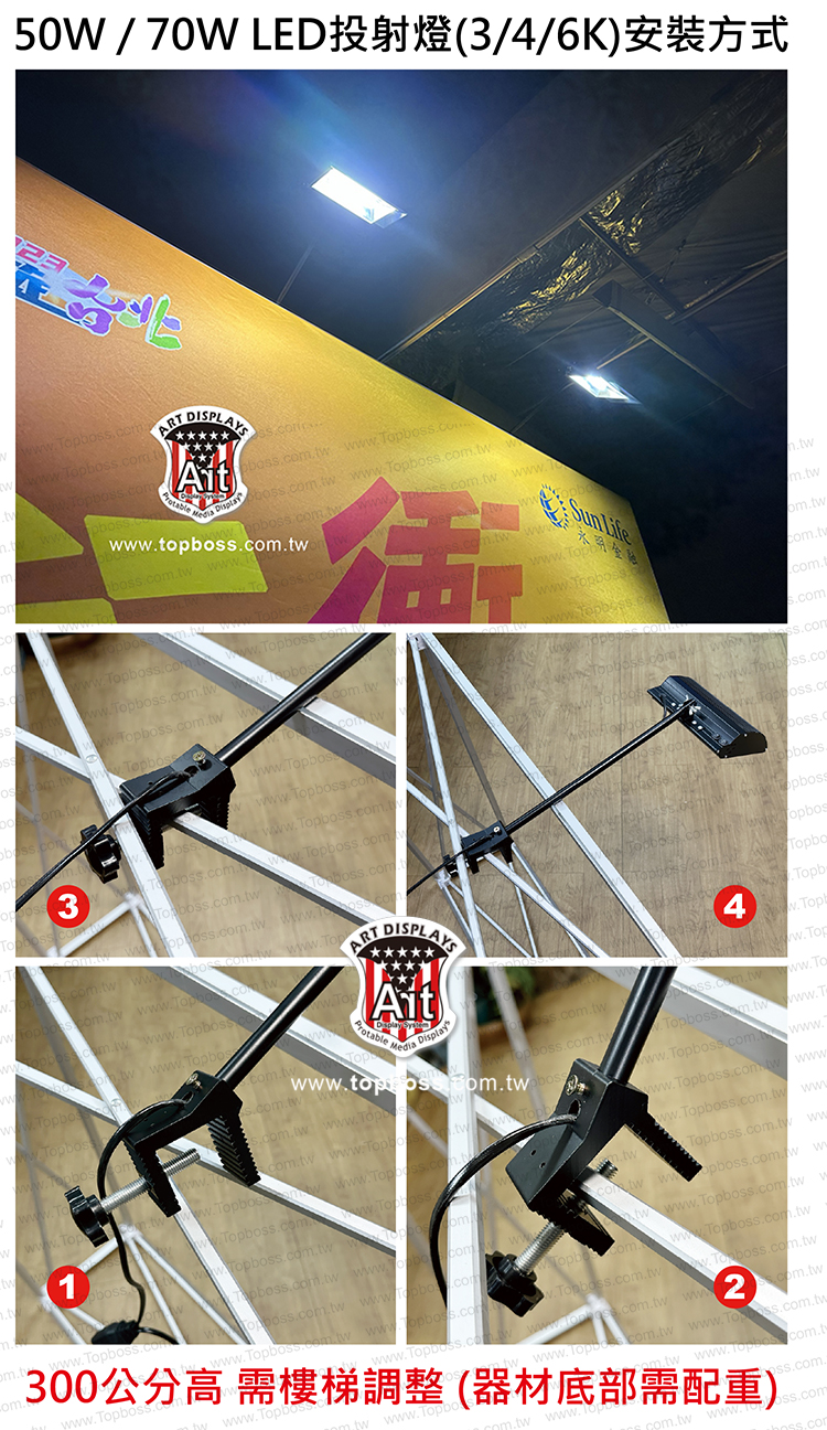 最新技術的拉網式卡布展屏 ,輕便的讓您難以置信集束成捆的網架 ,幾分鐘內彈起成一個大框架 ,既靈活又整潔,300cm高寬無接縫輸出 ,配合專用投射燈 ,令您的展品陳列光彩奪目 ,安裝簡易、無須任何工具;架身輕巧、易於攜帶;亦可自由組合及重覆使用,(若需現場安裝費用另計)。