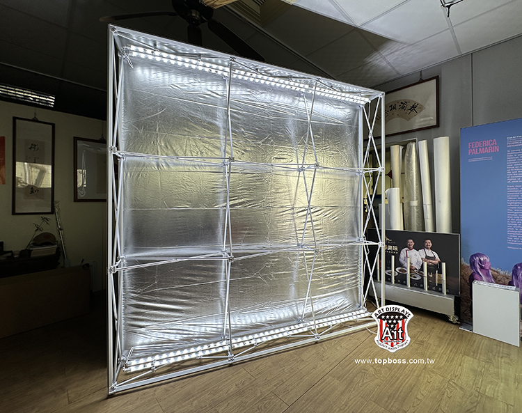 最新技術的拉網式卡布展屏 ,輕便的讓您難以置信集束成捆的網架 ,幾分鐘內彈起成一個大框架 ,既靈活又整潔,300cm高寬無接縫輸出 ,配合專用投射燈 ,令您的展品陳列光彩奪目 ,安裝簡易、無須任何工具;架身輕巧、易於攜帶;亦可自由組合及重覆使用,(若需現場安裝費用另計)。