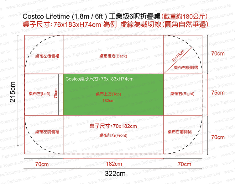 Costco桌巾展開尺寸: 215x322cm (桌子尺寸: W76xL183xH74cm)