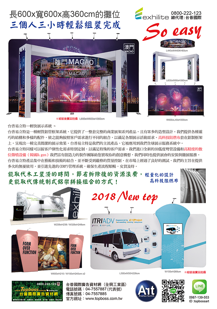輕量且完全客製化的結構設計,高科技阻燃布,數位微噴設備(韓國D.gen)寬300公分無接縫,全國最大輸出尺寸,重複使用能取代木工裝潢的時間,節省拆除後的資源浪費,更能取代傳統制式鋁架拼接組合呆板的樣式!