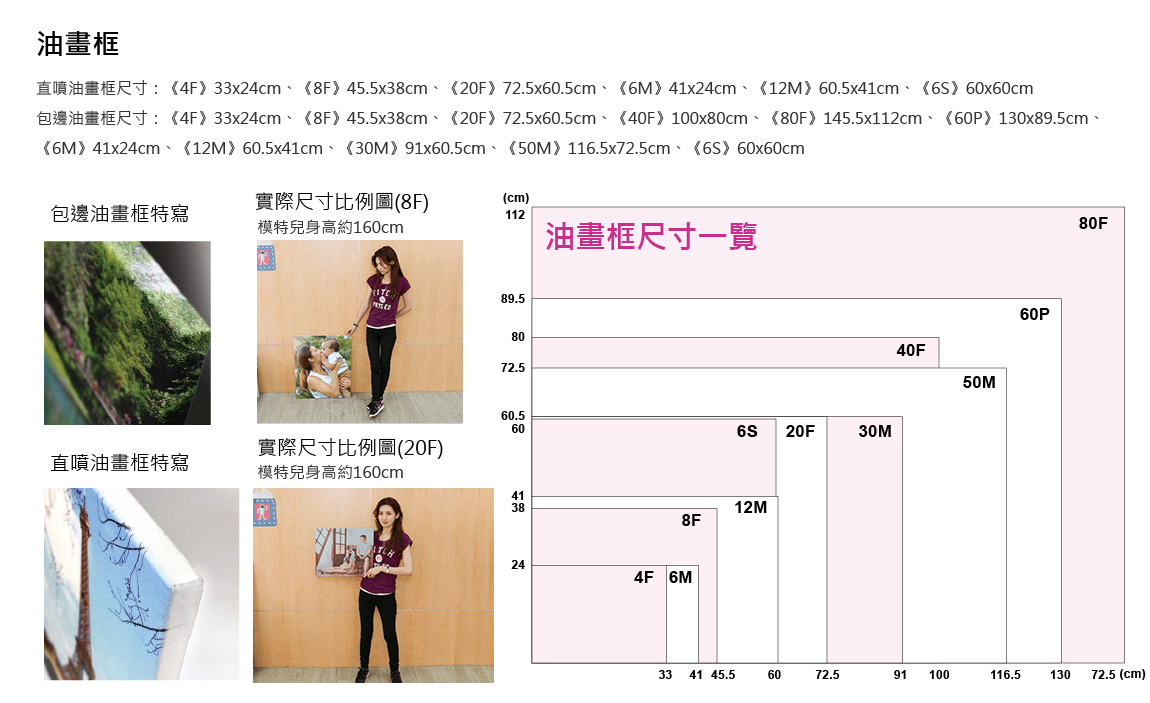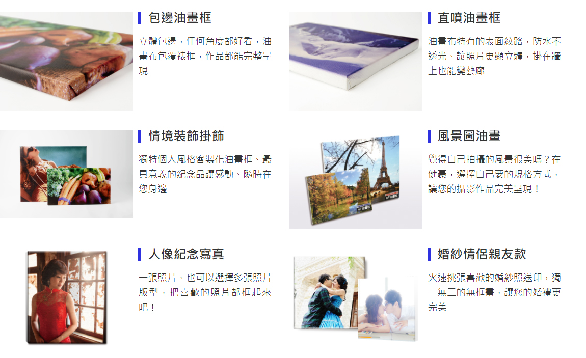 全台尺寸最多,交件速度最快!我們有直接噴印油畫框讓框的厚度留白和包邊油畫框可讓圖延伸到四邊框的厚度。適用於婚禮佈置、居家擺飾、生日送禮,旅遊美照、親子時刻、藝術創作、婚紗攝影!