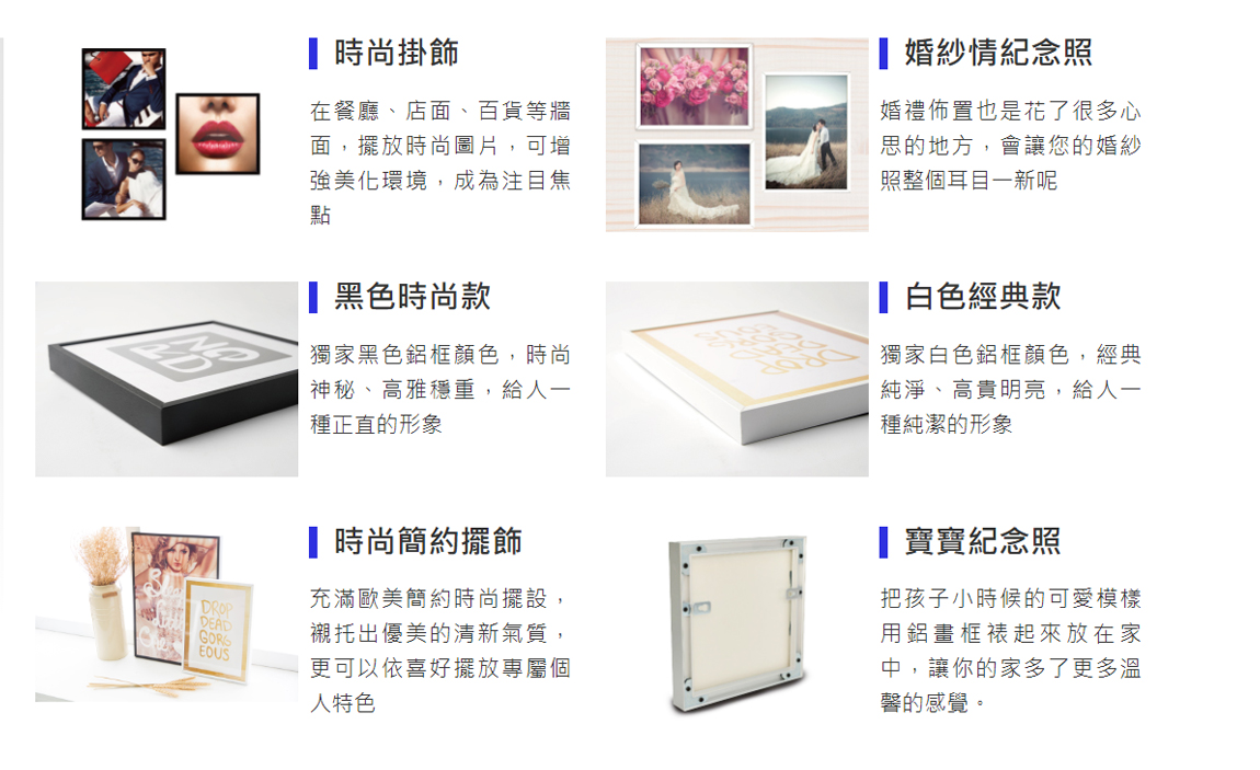 將婚約甜蜜、相聚歡樂、寶貝成長寫真、家旅合照的永恆瞬間,裝飾在日常生活中。健豪擁有多種鋁框尺寸規格供您挑選,交件速度位居全台之冠,利用質感鋁框讓框畫品質提升再升級,快把您的專屬照片找出來佈置家裡吧!