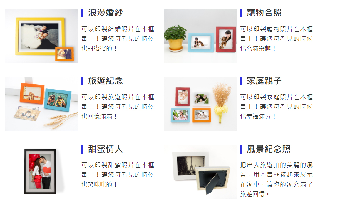 將婚約甜蜜、相聚歡樂、寶貝成長寫真、家旅合照的永恆瞬間,裝飾在日常生活中。健豪擁有多種木框顏色、尺寸規格供您挑選,交件速度位居全台之冠,利用手感木框、質感壓紋讓框畫品質提升再升級,快把您的專屬照片找出來佈置家裡吧!