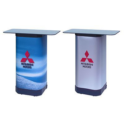產品特性︰利用一個帶輪多功能航空拉桿包,加上膠板加工而成簡易形櫃台,桌板收起時可置入拉桿包,節省攜帶之空間,畫面可用輸出方式或卡點西得加工。