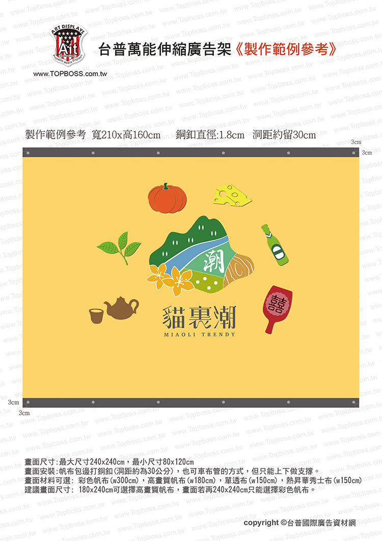 畫面安裝: 可在四邊打銅釦(洞距30公分),也可車布管的方式,但只能上下做支撐。(請參考捷安特圖示部分)