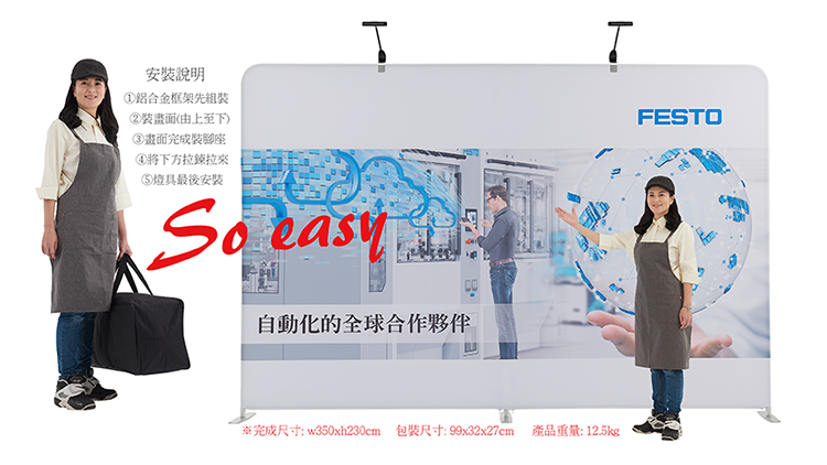 輕量且完全客製化的結構設計,高科技阻燃布,數位微噴設備(韓國D.gen)寬300公分無接縫,全國最大輸出尺寸,重複使用能取代木工裝潢的時間,節省拆除後的資源浪費,更能取代傳統制式鋁架拼接組合呆板的樣式!