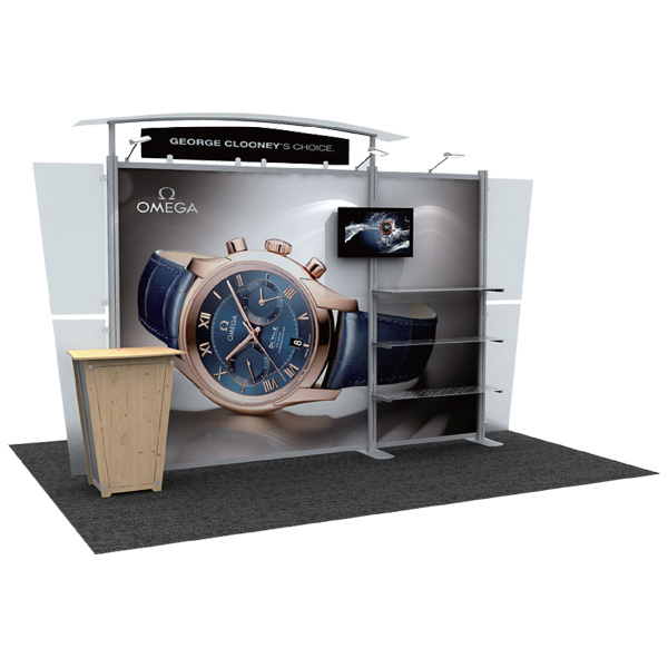 但是在展位的正面和背面可能會使用剛性面板。這個 Magic-window系統將定制模組化解決方案發展成一個可提供高達 30'x30“展位系統。Magic-window 解決方案非常適合國際大型展會,特殊活動裝飾和銷售點展示。