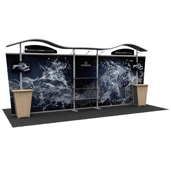 但是在展位的正面和背面可能會使用剛性面板。這個 Magic-window系統將定制模組化解決方案發展成一個可提供高達 30'x30“展位系統。Magic-window 解決方案非常適合國際大型展會,特殊活動裝飾和銷售點展示。