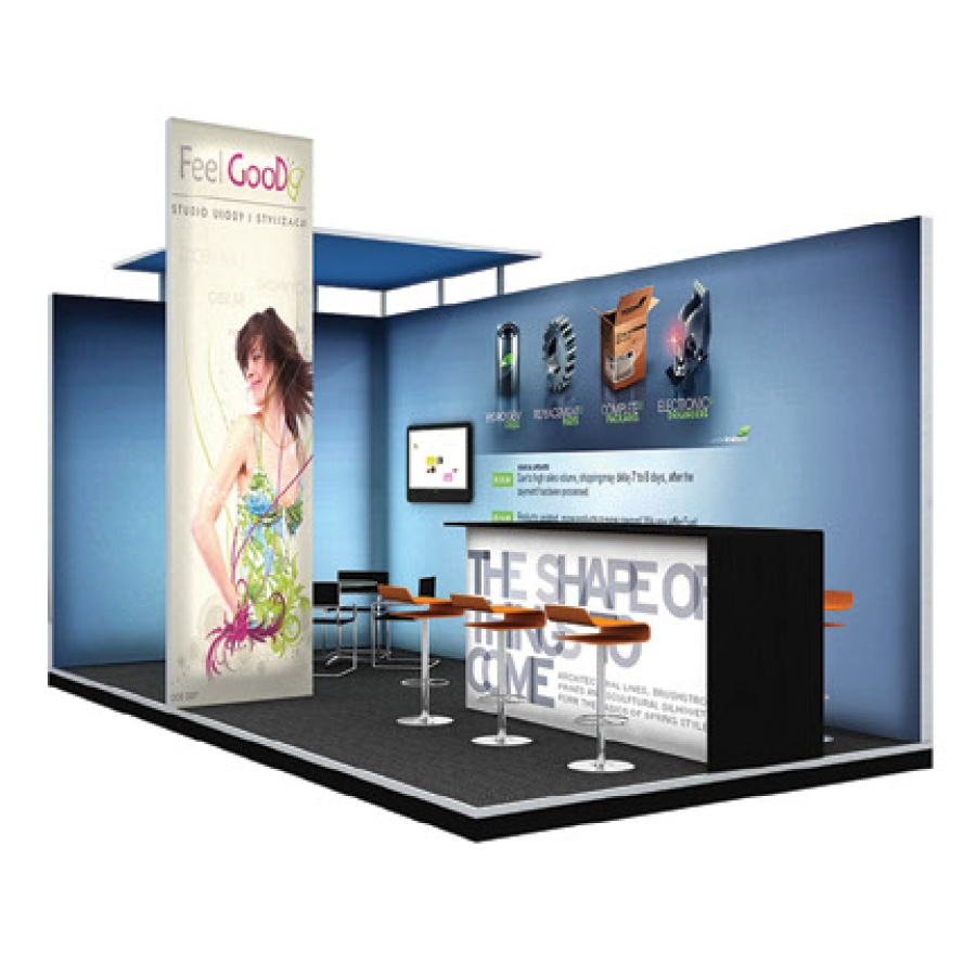 但是在展位的正面和背面可能會使用剛性面板。這個 Magic-window系統將定制模組化解決方案發展成一個可提供高達 30'x30“展位系統。Magic-window 解決方案非常適合國際大型展會,特殊活動裝飾和銷售點展示。