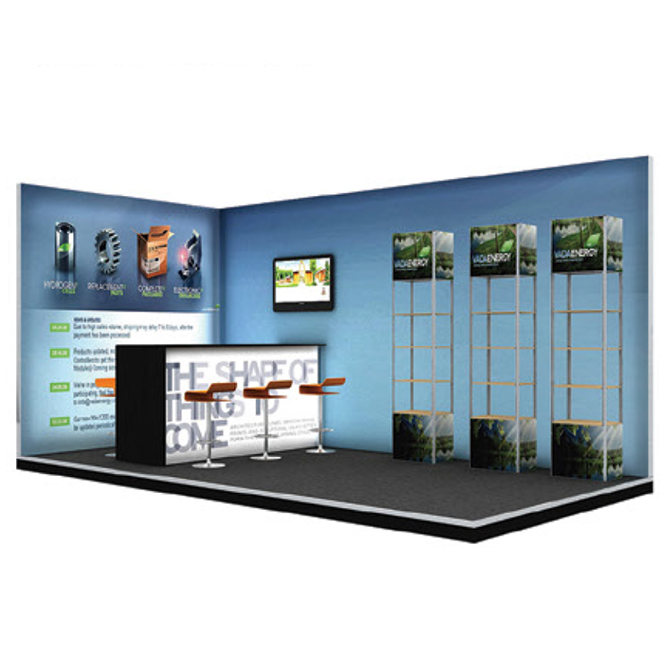 但是在展位的正面和背面可能會使用剛性面板。這個 Magic-window系統將定制模組化解決方案發展成一個可提供高達 30'x30“展位系統。Magic-window 解決方案非常適合國際大型展會,特殊活動裝飾和銷售點展示。