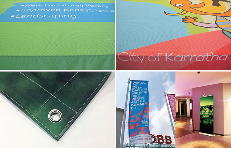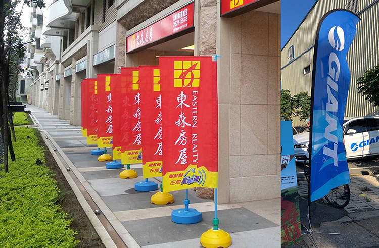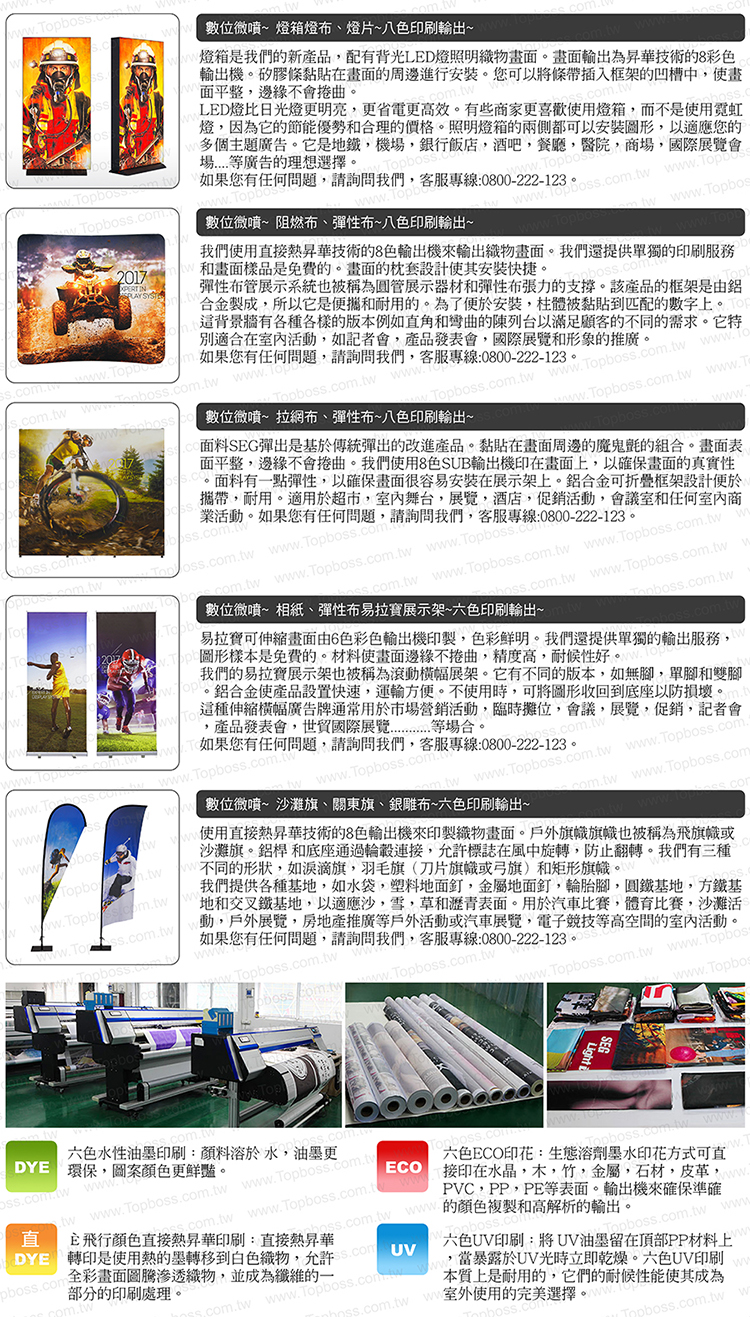 印製的材料目前有:阻燃布(不可水洗)、彈性布(可水洗)、熱昇華單透布、雙透旗幟布、背打光燈箱布、抗風帆布、一般帆布.............等。