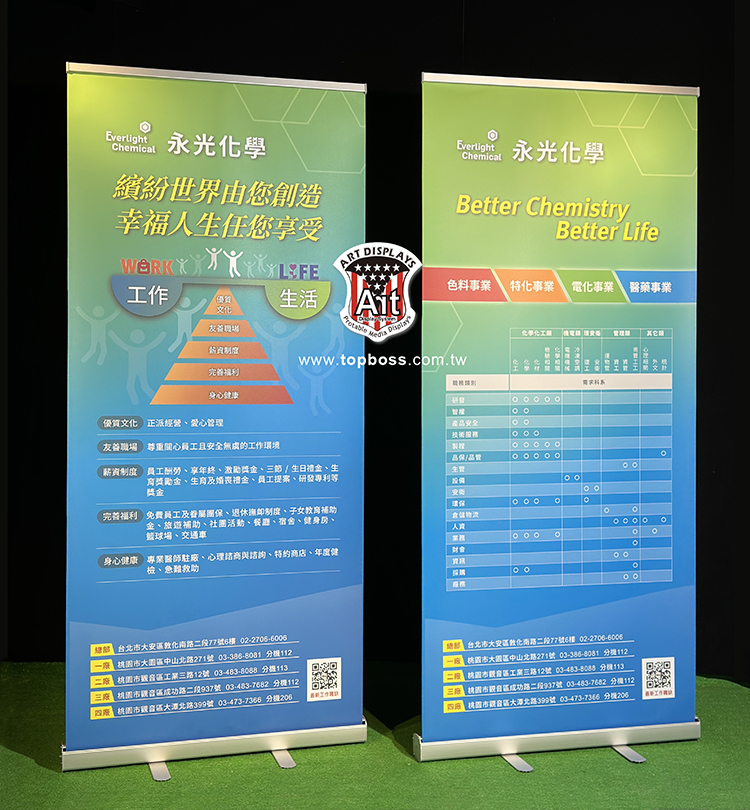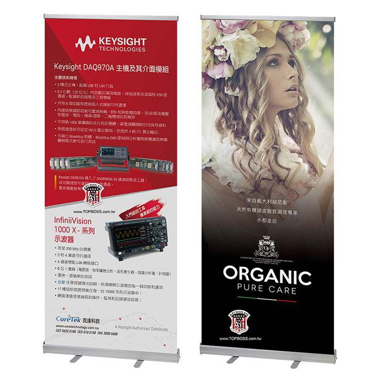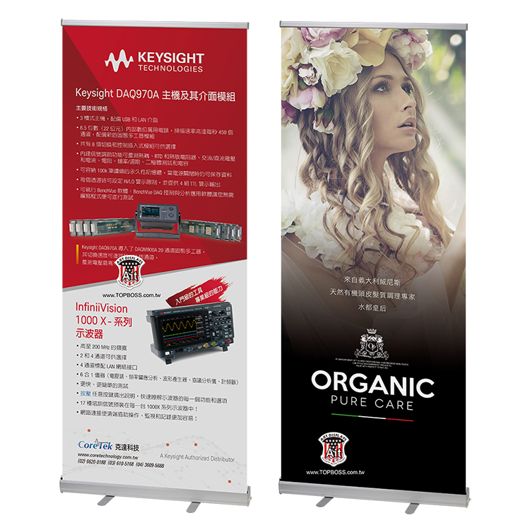 高科技鋁合金材質,桿身高度可伸縮式設計,簡易的組裝方式,海報自動收捲於展架主體內,即拉即用。可更換展示輸出品,展架重複使用成本低、效益高30秒立即展示,攜帶方便易於會場佈置、出國參展。展架桿身為可調式的伸縮桿,伸縮高度範圍90~200cm,可依照海報的高度做調整。
