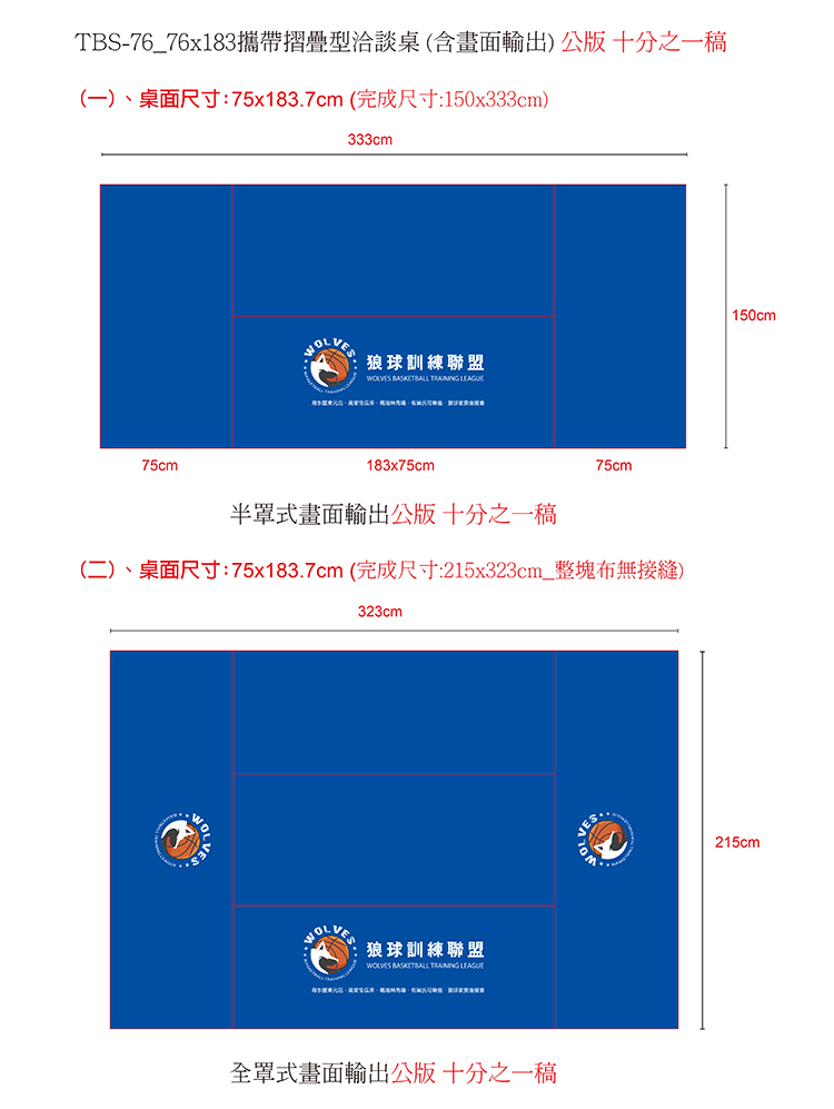 全罩式桌巾: 為三片式,上下兩片為長面觸地桌擺,中間片依照桌子實際長度再加寬面觸地桌擺,加工後寬幅最多可達148cm。