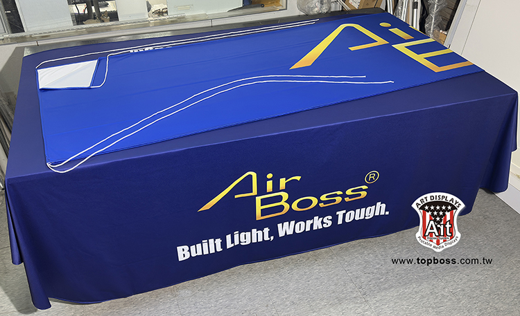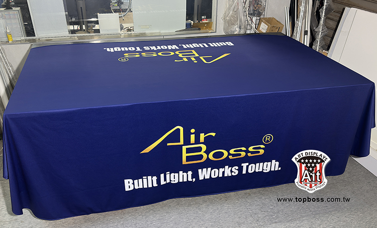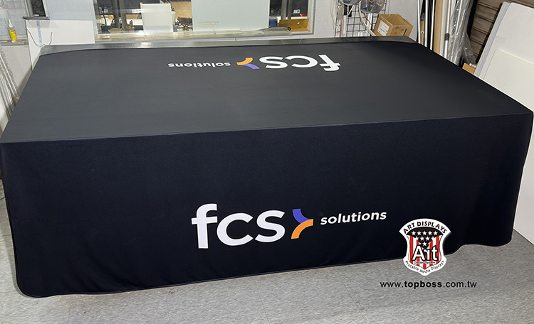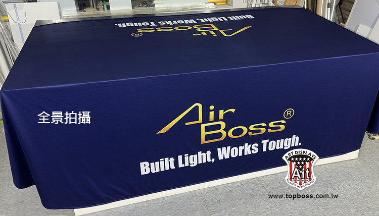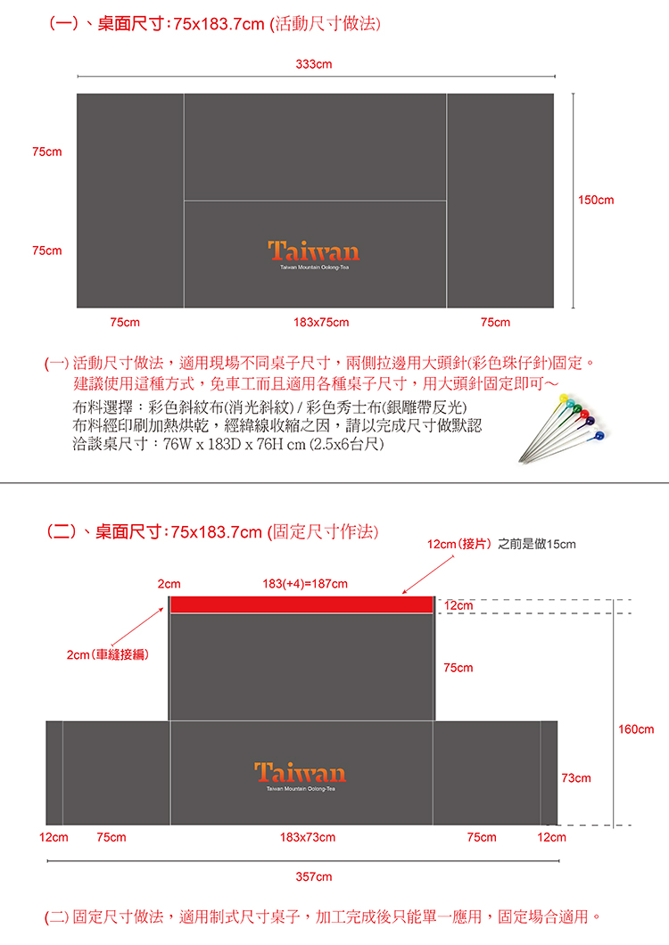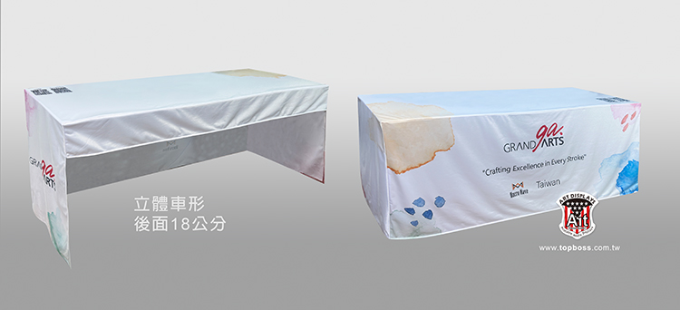 全罩式桌巾: 為三片式,上下兩片為長面觸地桌擺,中間片依照桌子實際長度再加寬面觸地桌擺,加工後寬幅最多可達148cm。