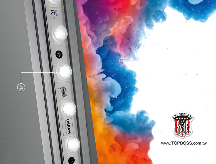 超輕和明亮的LED燈箱,厚度僅8公分安裝時輕巧容易,無需工具即可快速組裝。