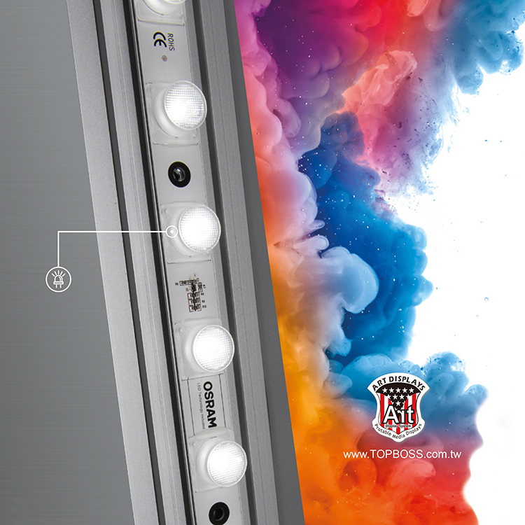 LEDUP由優質陽極氧化鋁製成,具有抗紫外線性能。設計和形狀非常苗條永恆優雅。帶有細緻的表面處理,即使邊緣也令人愉悅。組裝後畫面連接器幾乎不可見。您的燈箱畫面從各個角度看起來都具有吸引力,高品質的歐司朗LED技術的設計,讓你在產品做最完美的呈現。