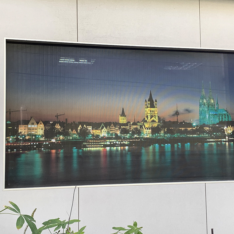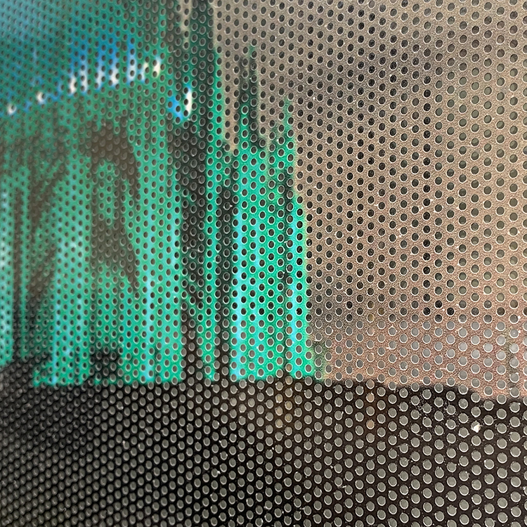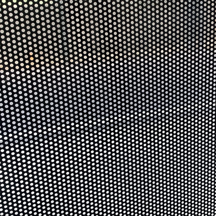 洞洞貼膠面為黑色,通常用於玻璃表面廣告,此材質特性為單面透視,由光線弱的一面可以視看到亮面的景物,光線強的一面無法透視,即看到輸出畫面,可由裡向外看,外看不到裡面的特性。