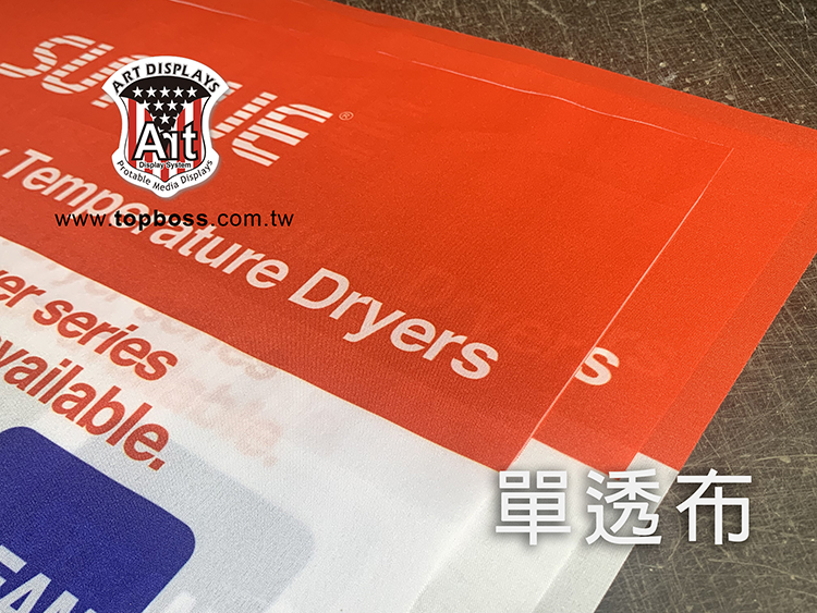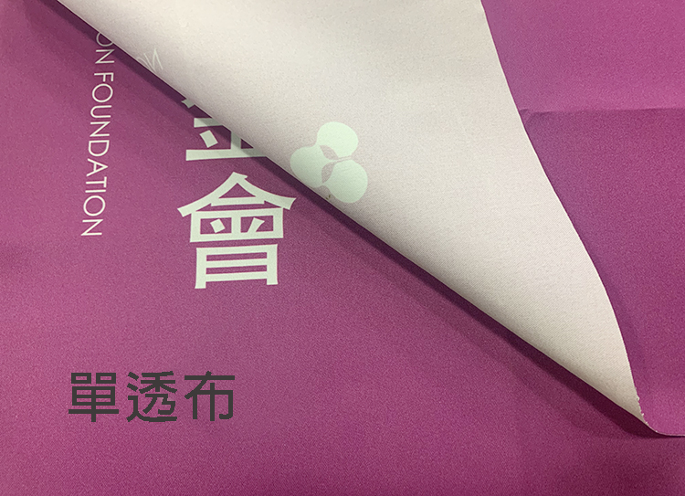 產品特性:輪出後只呈現單面圖文效果,適用展覽佈置,店面橫式、直式全彩布條,搭配各式掛軸或配合旗竿、旗座配件、或後加工。