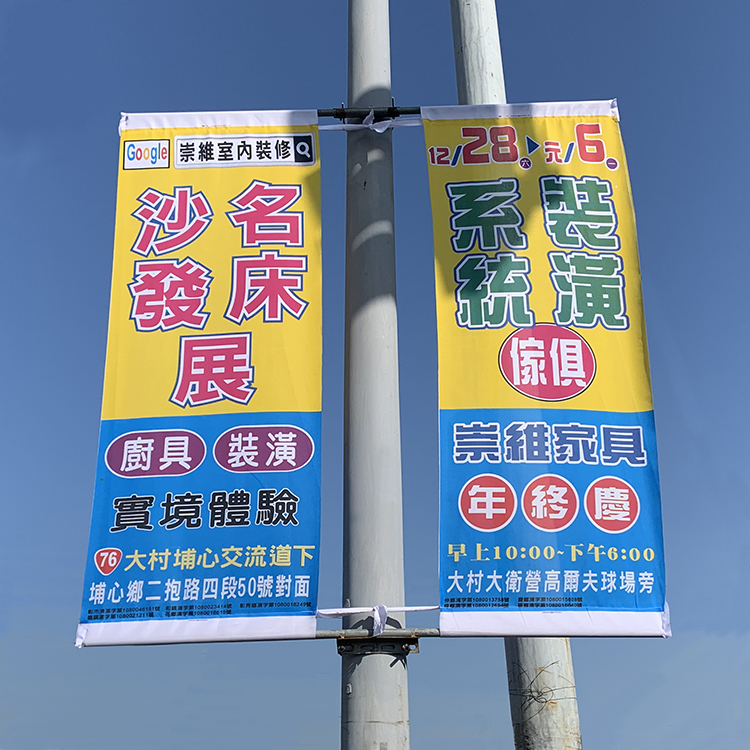 產品特性:會場、大樓周邊的必備廣告佈置,適用各種演唱會活動宣傳、餐廳行銷、企業形象宣傳、運動路跑賽事、節慶活動,能有效營造現場氣氛,讓活動的整體視覺形象更加完善。我們提供最優質的材質,加上最迅速的製作流程 。