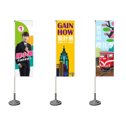 布旗類報價,含布、輸出、車邊、車布管(不含完稿及運費)。 火焰旗、路燈旗、手拿旗、桌上旗、刀旗幟稿時需套用公版製作。