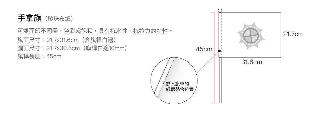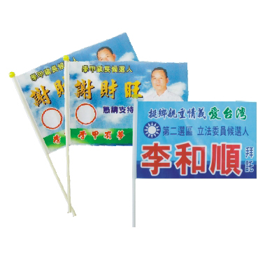 產品特性:雙透布手拿旗可製成選舉造勢用旗、班旗、隊伍旗幟、旅遊團旗,用途廣泛。把廣告訊息製作到旗幟內,讓參與活動、比賽的團體攜帶,營造現場的最佳熱鬧氣氛!我們提供最有效宣傳活動的行銷工具,我們的旗幟品質優良、顏色鮮豔,在業界市占率第一,且交貨速度位居全台之冠!