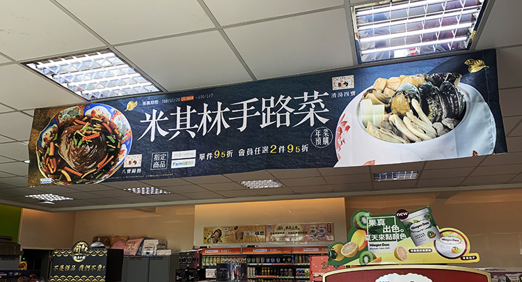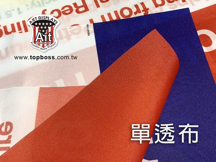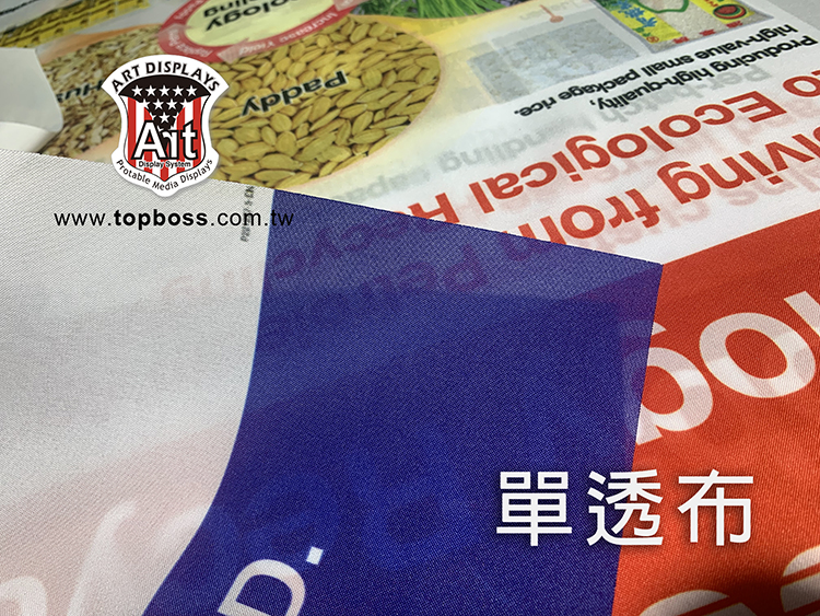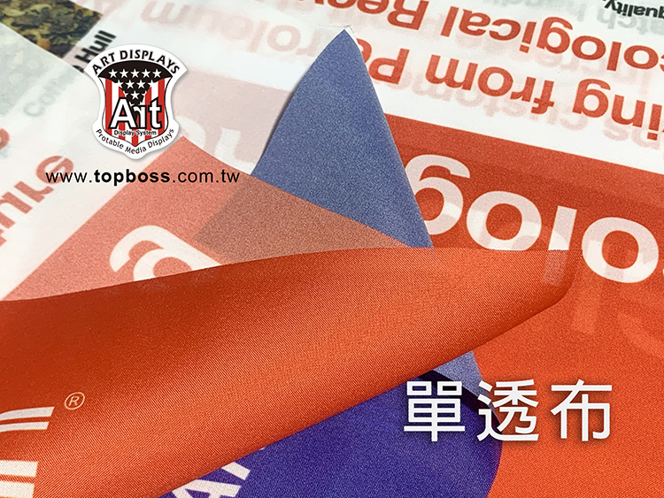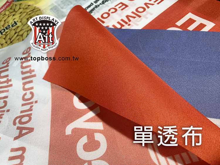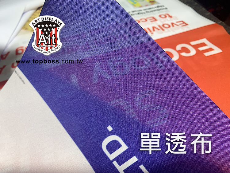 產品特性:輪出後只呈現單面圖文效果,適用展覽佈置,店面橫式、直式全彩布條,搭配各式掛軸或配合旗竿、旗座配件、或後加工。