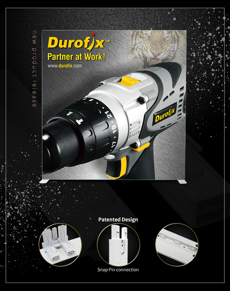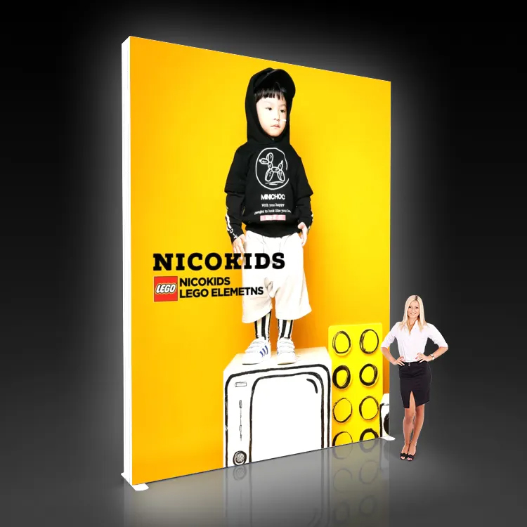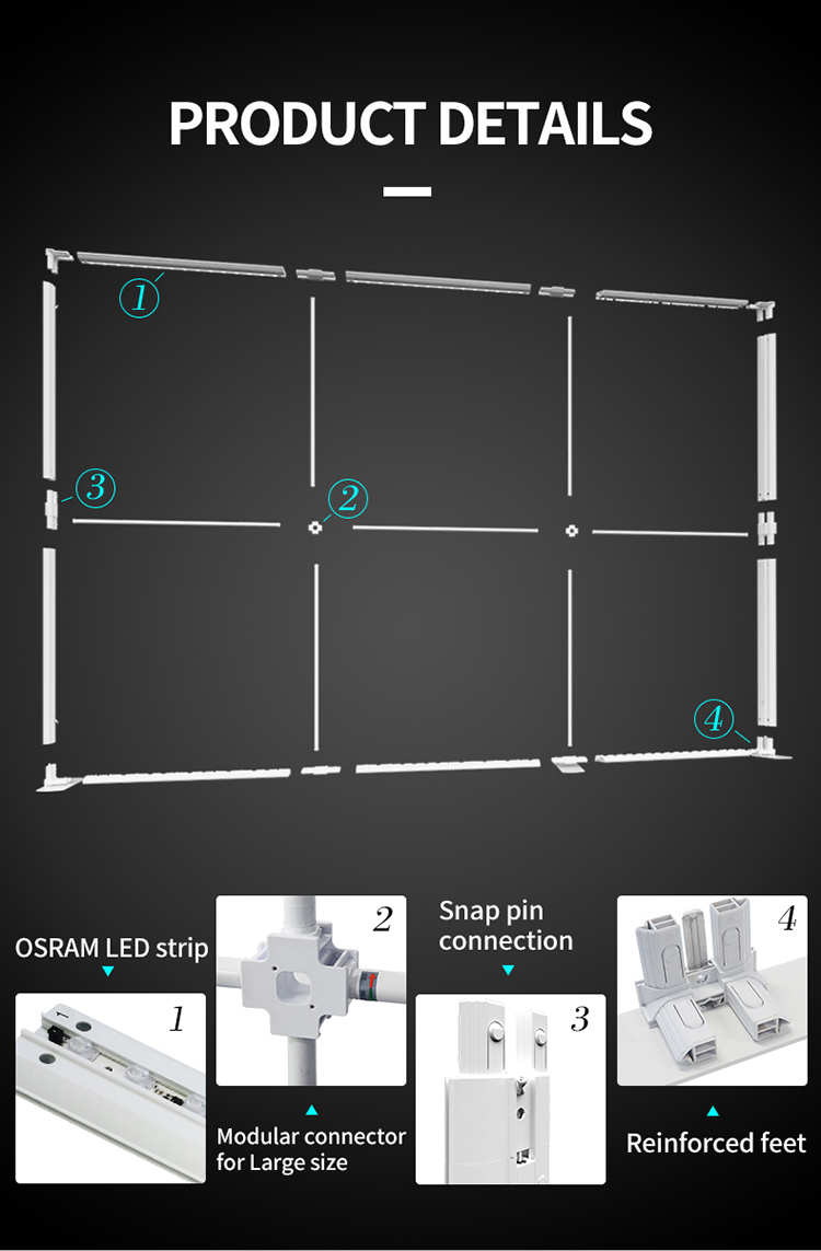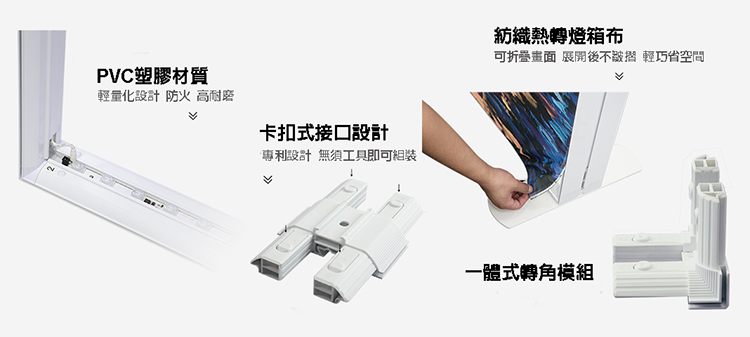 ※燈箱主體採用了全新(PVC材質)及(鋁合金材質)兩款提供選擇,所有模組化連結部件都是無工具彈扣防脫設計,這是燈箱產品的專利特點,使用材質通過防火測試;重要的是,相對鋁合金材質,在冷金屬的視覺上提升了不少的柔和效果,厚度選取了市場主流的120mm邊框。組合式燈箱背景上做了深度的設計和應用方案思考,該系統通過十字防脫連結塊和支撐杆,確保穩定和安全地把燈箱體進行無縫延展連接,實現大畫面展示的功能和效果。